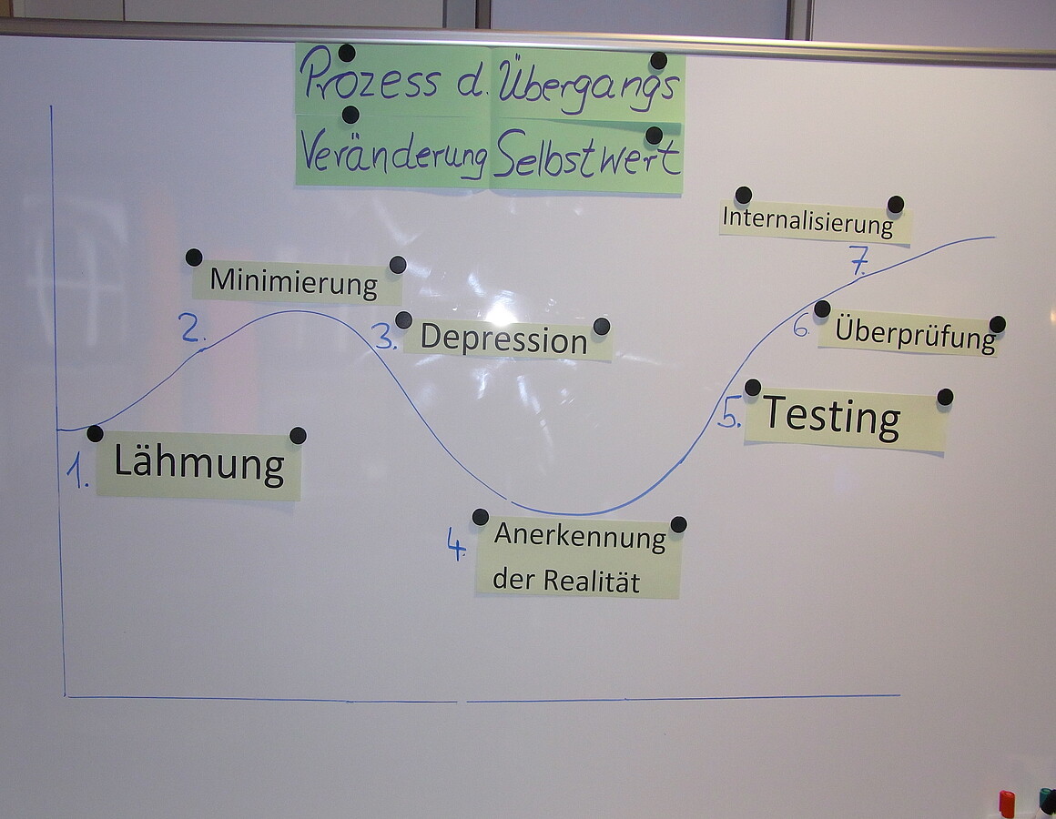 - Der Übergang von einem bekannten System (Schule) in ein neues, noch wenig bekanntes System (z.B. Betrieb) vollzieht sich in Phasen und hat Auswirkungen auf die Veränderung des Selbstwertgefühls (siehe Abbildung 1).