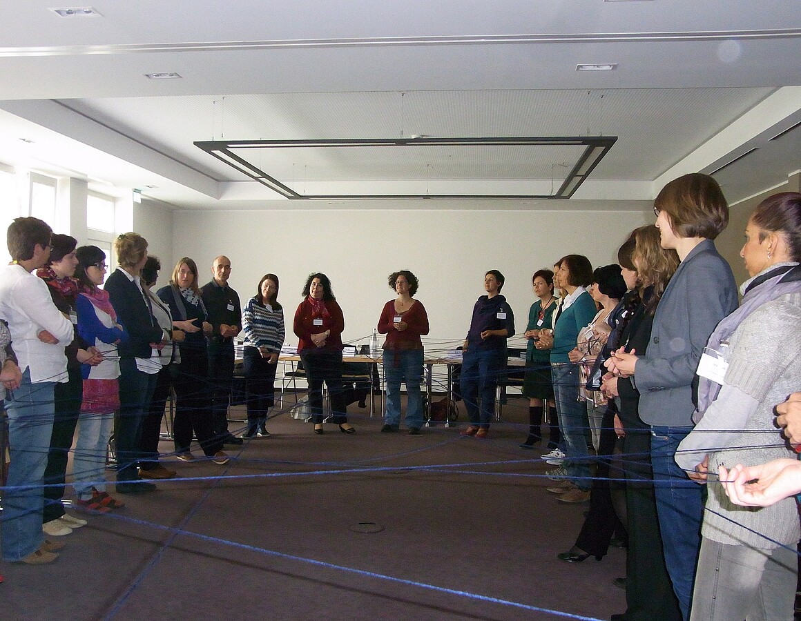 Nach einer kurzen Begrüßung durch Monika Seiler, Referatsleiterin "Förderung von Integrationsprojekten" im BAMF und Gabriele Schünemann, INBAS GmbH, wurde zwischen allen Teilnehmenden ein Netz "geknüpft". Diese aktivierende Übung gab den Teilnehmenden die Möglichkeit, ihren bisher größten Erfolg in der zurückliegenden Projektlaufzeit zu benennen und auf die besonderen Herausforderungen, die sie noch zu bewältigen haben, hinzuweisen.